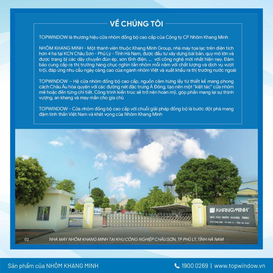 Thương hiệu cửa nhôm TOPWINDOW do Nhôm Khang Minh nghiên cứu và sản xuất với chuỗi đồng bộ khép kín từ hệ thống nguyên vật liệu cấu thành bộ cửa tới dịch vụ lắp đặt, bảo hành sản phẩm, mang lại giá trị tối đa mà các sản phẩm cùng loại không có. Topwindow thực sự là một kiệt tác đến từ sự khác biệt, tự hào là bước đột phá mang đậm tinh thần Việt Nam và khát vọng của Nhôm Khang Minh vươn tầm quốc tế. Do đó, để triển khai bán hàng hiệu quả, Topwindow đã cho ra mắt bộ ấn phẩm quan trọng. Trong đó không thể không kể đến catalogue cửa nhôm Topwindow.